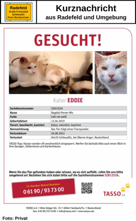 In Radefeld wird der Kater Eddie vermisst. Eddie ist hell rot mit weiß (siehe Fotos) Eddie war nicht nach Hause gekommen und wird von seiner Besitzerin seit dem 26.09.2023 vermisst und gesucht. Vielleicht hat ihn jemand gesehen oder Informationen über seinen Verbleib. Wer helfen kann meldet sich bitte mit Angabe der Suchdienstnummer S2812526 unter Telefon 06190 937300 beim TASSOe.V.. Vielen Dank für die Hilfe.