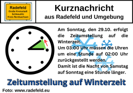 In der Nacht vom Samstag, den 28.10. zum Sonntag, den 29.10.2023 erfolgt die Zeitumstellung auf die Winterzeit. Um 03:00 Uhr müssen die Uhren um eine Stunde auf 02:00 Uhr zurückgestellt werden. Damit ist die Nacht vom Samstag zum Sonntag eine Stunde länger.