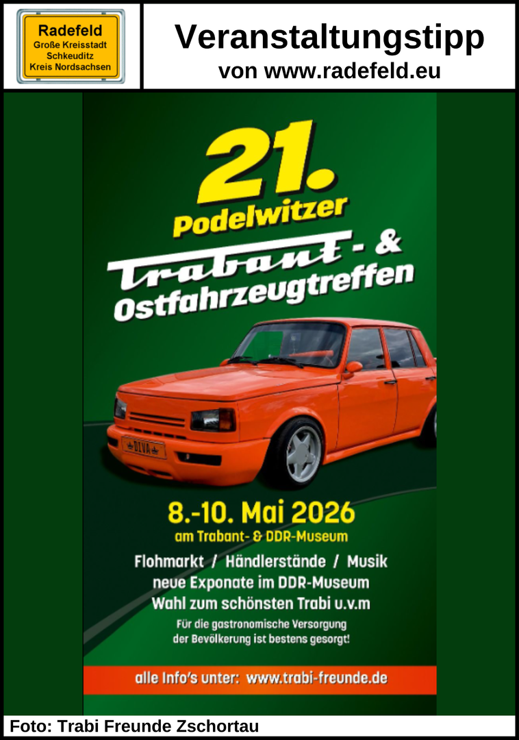 Die Trabi Freunde Zschortau laden zum 21. Podelwitzer Trabant- & Ostfahrzeugtreffen ein. Für die gastronomische Versorgung der Bevölkerung ist bestens gesorgt.