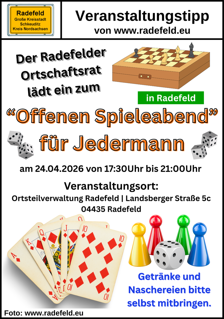 Der Radefelder Ortschaftsrat lädt zum Spieleabend nach Radefeld ein.