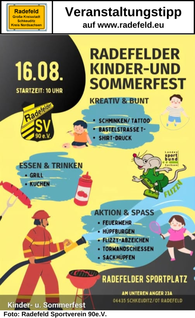 Unter dem Motto: Kreativ & Bunt lädt der Radefelder Sportverein 90 e.V. zum Kinder- & Sommerfest ein.
