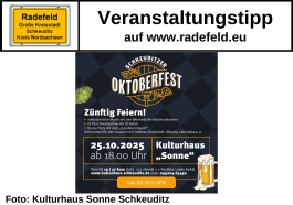 Bei volkstümlicher Musik mit den Wermsdorfer Blasmusikanten lädt das Kulturhaus "Sonne" zum Oktoberfest ein. Außerdem gibt es eine DJ-Ötzi Doubleshow mit DJ Anton und eine Disco-Party mit dem